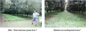 His comment was that he did not believe just how much grass there was until he heard the mulcher “screaming” under the mechanical load. It was also interesting to note the difference in the vitality of the grass within the TM treated rows and the external headland areas. Most importantly, this vitality is obvious in the trees. Mike is a little in awe of the fact that the trees and the potential crop have held up so well. Despite very dry and erratic growing conditions.